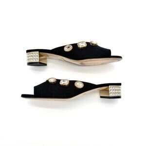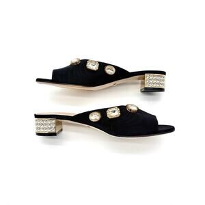 These Gucci Moire Satin Crystal Embellished The shoe features a low, textured block heel and a black fabric upper. It is embellished with large, oval-shaped crystal detail and an interlocking GG on the front.