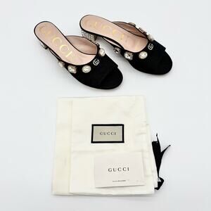 Gucci Moire Lyric Crystal Embellished Mules