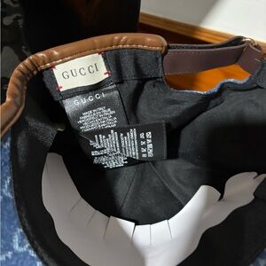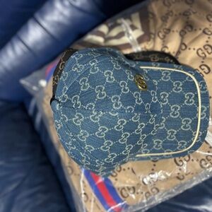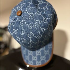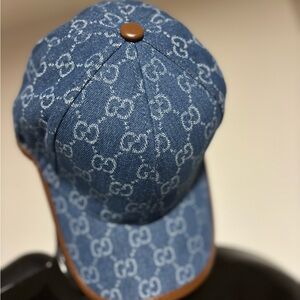 Stylish Gucci hat in blue denim. Features signature monogram design. Perfect for casual wear.