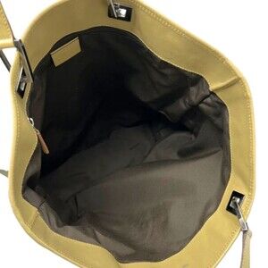 This Authentic Gucci tote bag showcases a sophisticated brown monogram pattern complemented by tan leather accents. The bag shows slight wear at bottom corners.