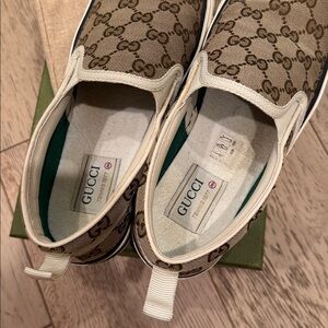 Elegant Gucci sneakers with iconic monogram pattern. Comfortable slip-on design. Perfect for casual outings. Comes with dust bag and original box. In good condition size 37.5 (8.5) women