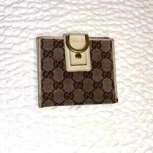 Gucci Monogram Canvas Bifold Compact Wallet Brown i& Ivory. Canvas in good condition. Cleaned as best as I could. Preloved. Wear on corners. Clean interior. See pictures for details.