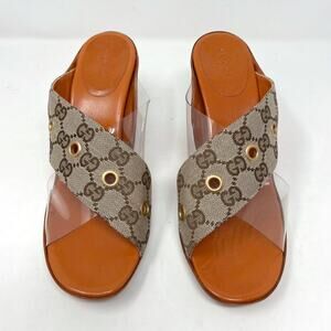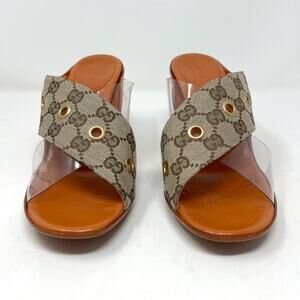 A Y2K-era Gucci sandal that’s pure retro perfection. Featuring the classic GG monogram canvas with gold grommet hardware, clear PVC straps, and a warm caramel leather footbed and heel, these open-toe slides are equal parts vintage and current. The stiletto heel adds lift while the mule style keeps them effortless. A standout piece for Gucci collectors or anyone craving a bold throwback silhouette.