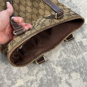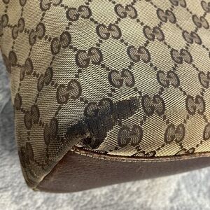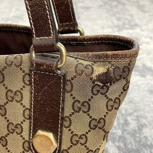 Gucci Monogram GG Small Charmy Tote Bag Brown Bolt Hardware Accent Luxury