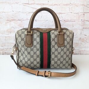 Gucci Monogram Leather Canvas Cream and Green Satchel Bag with Iconic Design