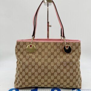 This is an authentic GUCCI Monogram Eclipse Tote in Pink. This stylish tote is crafted of classic Gucci GG monogram canvas with tall pink leather shoulder straps and trim along the top and the base. The light brass hardware links attach to large polished brass eyelets. The top is open to a spacious fabric interior with zippered pockets. This is an excellent tote, ideal for everyday use, from Gucci!