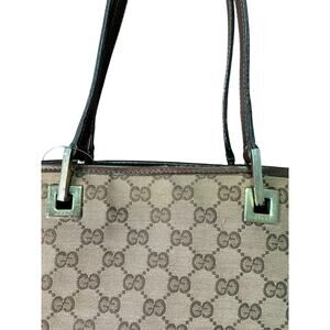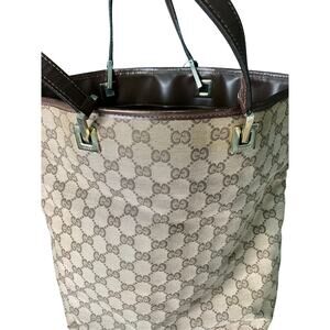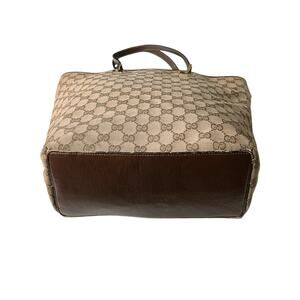 Elevate your style with this timeless Gucci tote bag, featuring the iconic GG monogram canvas and luxurious brown leather trim. This bag is in excellent condition and ready to add a touch of sophistication to your wardrobe.