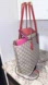Elegant Gucci tote featuring signature monogram design. Accented with striking red handles and a vibrant pink interior. Ideal for fashion-forward occasions. PRE-OWNED No major callouts rubbing/fading on corners of the bag.