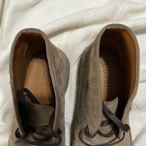 GUCCI "Suede Bear Ardesia" boots comes in a taupe textured suede featuring a chukka styleEmbroidered designslace upanda crepe sole.ImportedOn the left shoe is an owl- one of the animal symbols that are part of the Maisons aesthetics. On the right shoe is the UFO-belonging to creative directors enchantment for cosmos. - taupe suede - embroidered UFO patch on right shoe - embroidered owl patch on left shoe