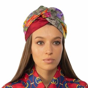 Stylish Gucci turban with vibrant floral design. Features red, purple, and orange accents. Perfect for a chic look.