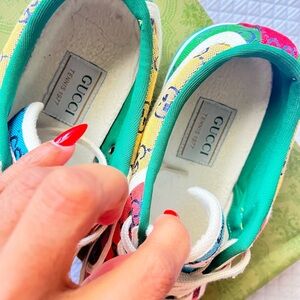 Multicolored Gucci sneakers with iconic GG pattern. Features a mix of green, red, blue, and yellow. Stylish and bold design. USED. Decent condition