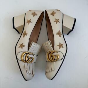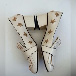 Gucci Ladies Embroidered Leather Mid-heel Pump. White leather with gold bees and stars embroidery.