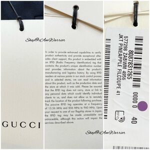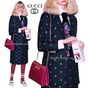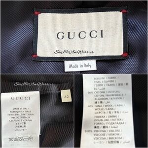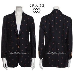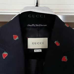 From Gucciโs Fall 2019 Collection, is this gorgeous NWT navy blue Fil Coupรฉ wool/cotton blend blazer with logo branded strawberry print & gold tone buttons. Full lined. Italian size 40 equates to a US 4. See photos for measurements. Comes with originally tags & designer hanger. Please note: designer tag has โpineappleโ listed, which was also for this strawberry & cherry designs as verified by Gucci. Price includes free Poshmark authentication & inspection.