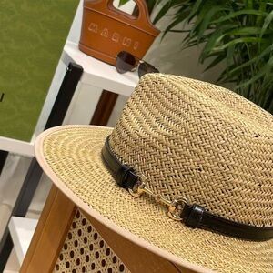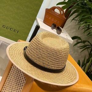 Elegant straw hat by Gucci. Accented with a black leather band. Ideal for sunny outings.
