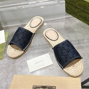 Step into luxury with these Gucci navy blue espadrille slides. Perfect for casual outings, these stylish shoes offer comfort and elegance. SIZE 9