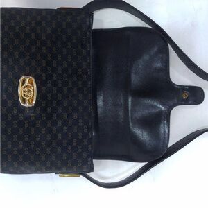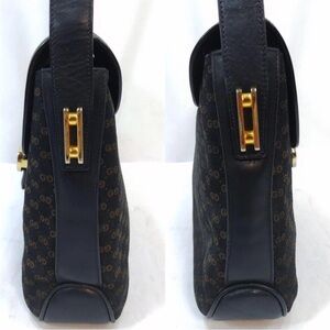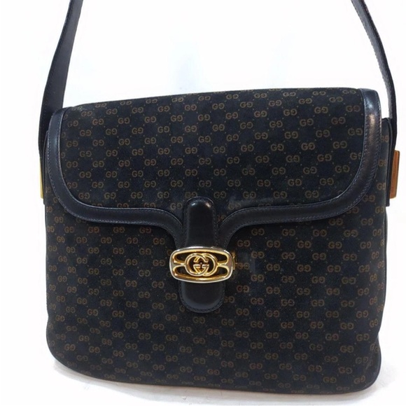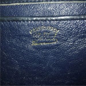 Elegant navy leather bag. Features gold embossed logo. Perfect for any occasion.