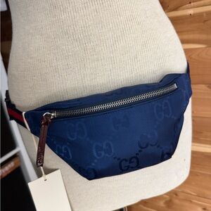 100% authentic Gucci belt bag in navy. Features iconic monogram pattern. Secure zip closure. Perfect for essentials. This is from the children’s line. Also perfect for adults. Also, just on the small side, but fits bigger iPhone perfectly. this item is brand new comes with original dust bag and the little gucci cards. If you have any questions, feel free to ask.