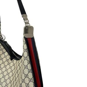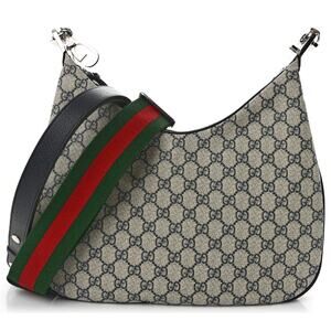 • Features: Comes with an extra green and red striped strap, original dust bag and care cards, and a card of authenticity, Signature coated canvas exterior with navy web monogram GG pattern, Leather trim on edges, Zip up closure, Adjustable navy leather strap with attachable, adjustable cloth green and red striped strap, Silver toned hardware, Navy and red striped cloth sides and bottom, Cloth interior lining with a zipper compartment, Gucci Navy Supreme Web Monogram Coated Canvas Large Attache Shoulder Bag