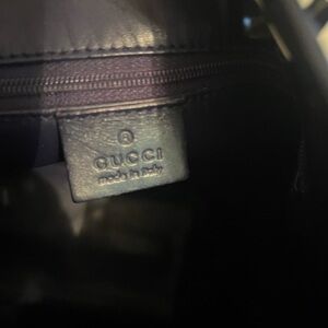 Elegant Gucci handbag in navy with black trim. Features a metallic logo plaque.
