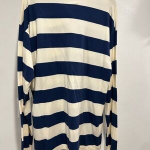 Stylish Gucci polo shirt with navy and white stripes. Features red collar and logo details. Worn once stain at the bottom hem of shirt other than that still has the tag 100% authentic.. Great condition