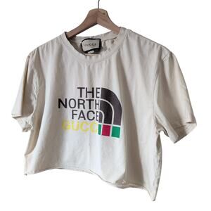 Gucci x North Face collaboration t-shirt, made in Italy. This super soft tee has been personally altered with a trendy crop cut. Please note a minor flaw: there is some cracking in the logo. See photos for a close-up view of this detail. Measurements: Length: 17 inches, Pit to pit: 22 inches. A unique piece with a personal touch!