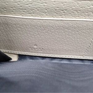 Elegant Gucci Off The Grid long zip wallet in gray nylon jumbo Guccissima and light tan/beige leather. Features center logo detail, 3 note compartments, 12 card slots, and 1 coin compartment.