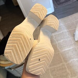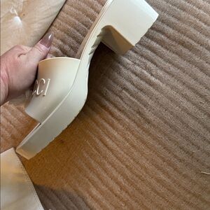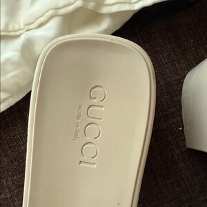 100% authentic Gucci platform cream logo mules size 40 I will say I am personally a 8 1/2-9 and these fit me if you have a very thin foot, it may be different