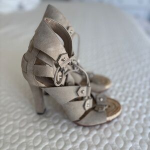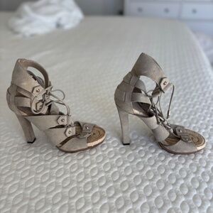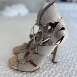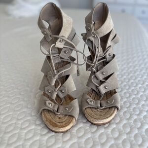 GUCCI Jasmine Beige Suede Lace Up Espadrille Heeled Sandals, Size 37.5