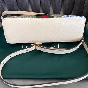 *includes Gucci cards •GG canvas •White leather trim •Gold toned hardware •Green and red Web stripe •Cotton linen lining •Double G zipper pulls •Adjustable shoulder strap/ cross body