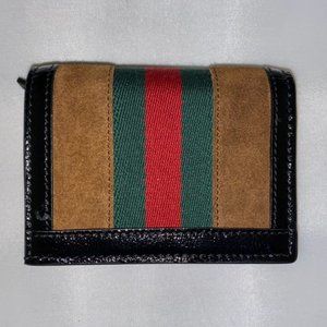 Brown and black card case from Gucci. Made of suede. Trimmed in patent leather with a texture throughout. Fastened with a press-stud. Enriched by a green-red-green 'Web' stripe and gold-tone branded metal hardware. This is a wonderful wallet for everyday conveniences, from Gucci!