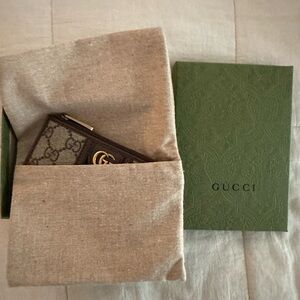 New, never used and in box. Beige and ebony GG Supreme with green and red Web stripe, with Double G hardware. Holds 5 cards and a zipper to hold coins.