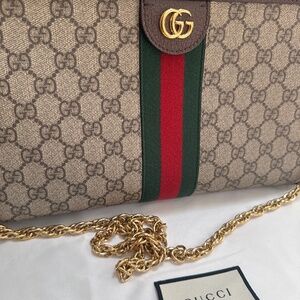 Gucci Ophidia large bag, grosgrain leather with gold chain link shoulder strap, double G logo and gold hardware, inside satin lining with duel pockets, and snap closure on top! Comes with dust bag. Vintage inspired design, only taken out one time, almost brand new! Inside & out is in mint condition no flaws! 💯 authentic, bought myself in the Gucci store!
