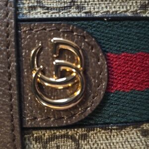 Features GG Supreme canvas with iconic green/red web stripe, gold-tone Double G logo, and leather trim. Zip top closure with card slots.