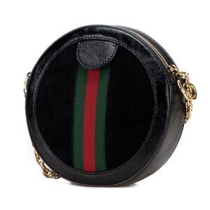A compact, circular-silhouette crossbody rendered in rich suede, this design fuses vintage charm with the iconic Ophidia aesthetic. It features polished gold-tone interlocking GG hardware, patent leather edge trims, and a signature Web (green-red-green) accent that speaks to the brand’s heritage. The bag swings from a chain strap (usable crossbody or shoulder style), offering versatility and elegance in a mini form.