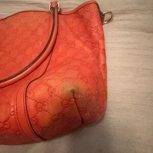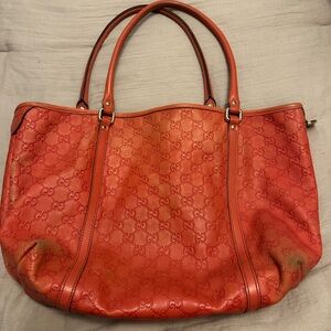 Elevate your style with this stunning red embossed tote bag from Gucci. Perfect for any occasion, this bag combines luxury and functionality. Well loved, very used condition. Price reflects condition. Approx 15" wide, 11" high.