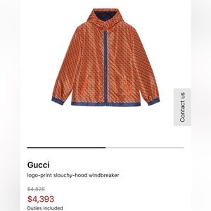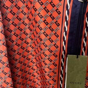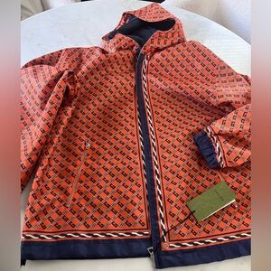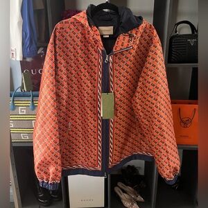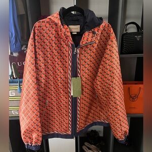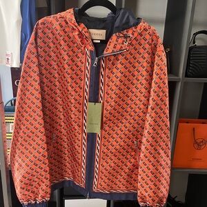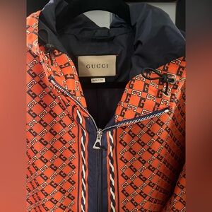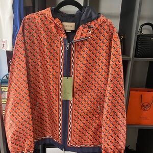 Stylish Gucci jacket with an orange geometric pattern. Features a zip-up front and hood. Brand new with tags. Size 48 men’s..