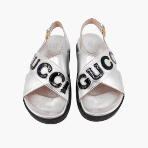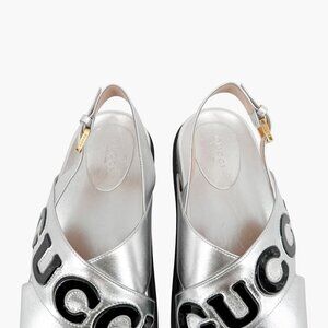 Gucci Ornella Slingback Sandals EU 38.5 US 8.5 Silver Leather Logo Cross Flat