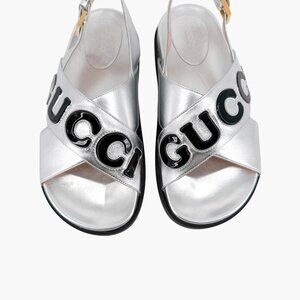 Gucci Ornella Criss-Cross Logo Sandals in Metallic Silver Leather