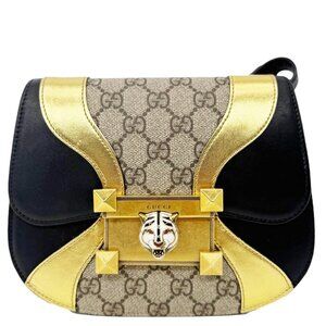 The GUCCI Osiride Small Shoulder Bag in Gold GG Supreme Canvas features a structured silhouette with vintage-inspired detailing. Accented by a bold feline head closure and smooth leather trim, it’s a statement piece with timeless flair.