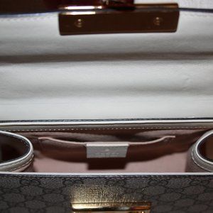 A small structured GG Supreme canvas bag with a leather top and our key lock closure Missing Key. The sliding chain strap can be worn multiple ways, changing between a shoulder and a top handle bag.
