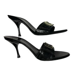 Features: buckle accent, stiletto heel, black patent leather, slip on