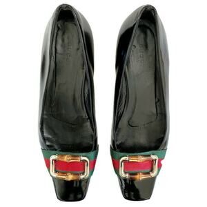 Gucci Patent Leather Signature Web Bamboo Buckle Loafers featuring square toe, classic web grosgrain ribbon trim, bamboo and gold tone buckle ornament, patent covered block heel and leather lining and soles. Approximate Heel Height: .5”. Size: 7.5. Color: Black. Chipped patent on outer toe box of both shoes (see photo). No dust bag or shoe box.