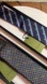 Set of two Gucci ties. One tie features a black and gold pattern. The other tie has a blue and gold striped design. Elegant and stylish.