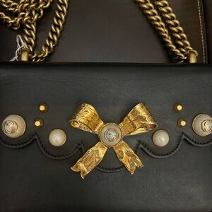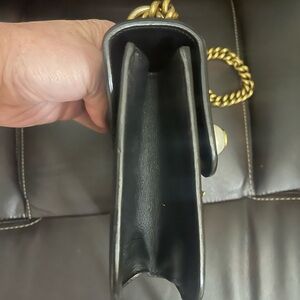 This elegant Gucci crossbody bag features a luxurious quilted black leather design, accentuated by gold-tone chain straps and hardware. The structured silhouette is enhanced with a classic flap-over closure, offering a timeless and sophisticated look. Perfect for elevating any outfit with its chic and refined style.
