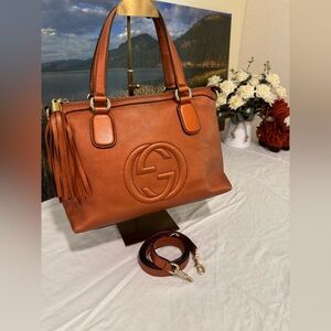 Beautiful authentic with digital COA GUCCI Pebbled Calfskin Small Soho Top Handle Bag in Metallic copper.