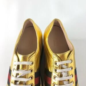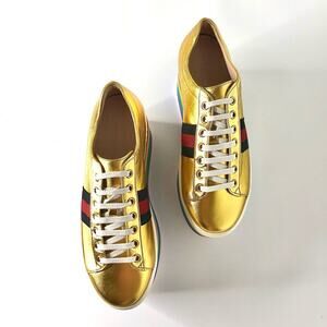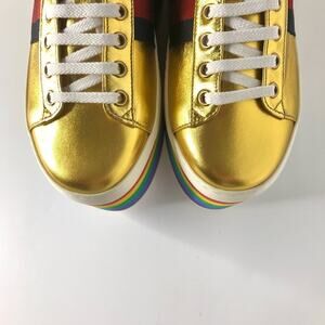 Gucci Peggy Mettalic Gold Rainbow Platform Lowtop Lace Up Sneakers 38.5