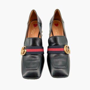 Gucci Peyton GG Pearl Loafer Pumps EU 37.5 US 7.5 Black Leather Block Heel Logo