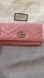 Chic Gucci wallet in pink leather. Chevron pattern with iconic logo. Compact and stylish.