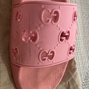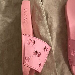 Chic pink slides with embossed Gucci logo. Perfect for casual wear. I do not have the box but I do have the bags for them.