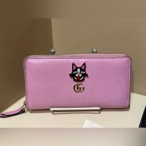 This Gucci wallet is a limited edition piece which means that you will be amongst only a handful of women to own one of it. It comes from a capsule collection that features Alessandro Michele's Boston Terriers named Bosco. The wallet comes crafted from leather and decorated with Bosco's face and the GG logo on the front. It is equipped with a zipped pocket and enough slots to hold the things you need.